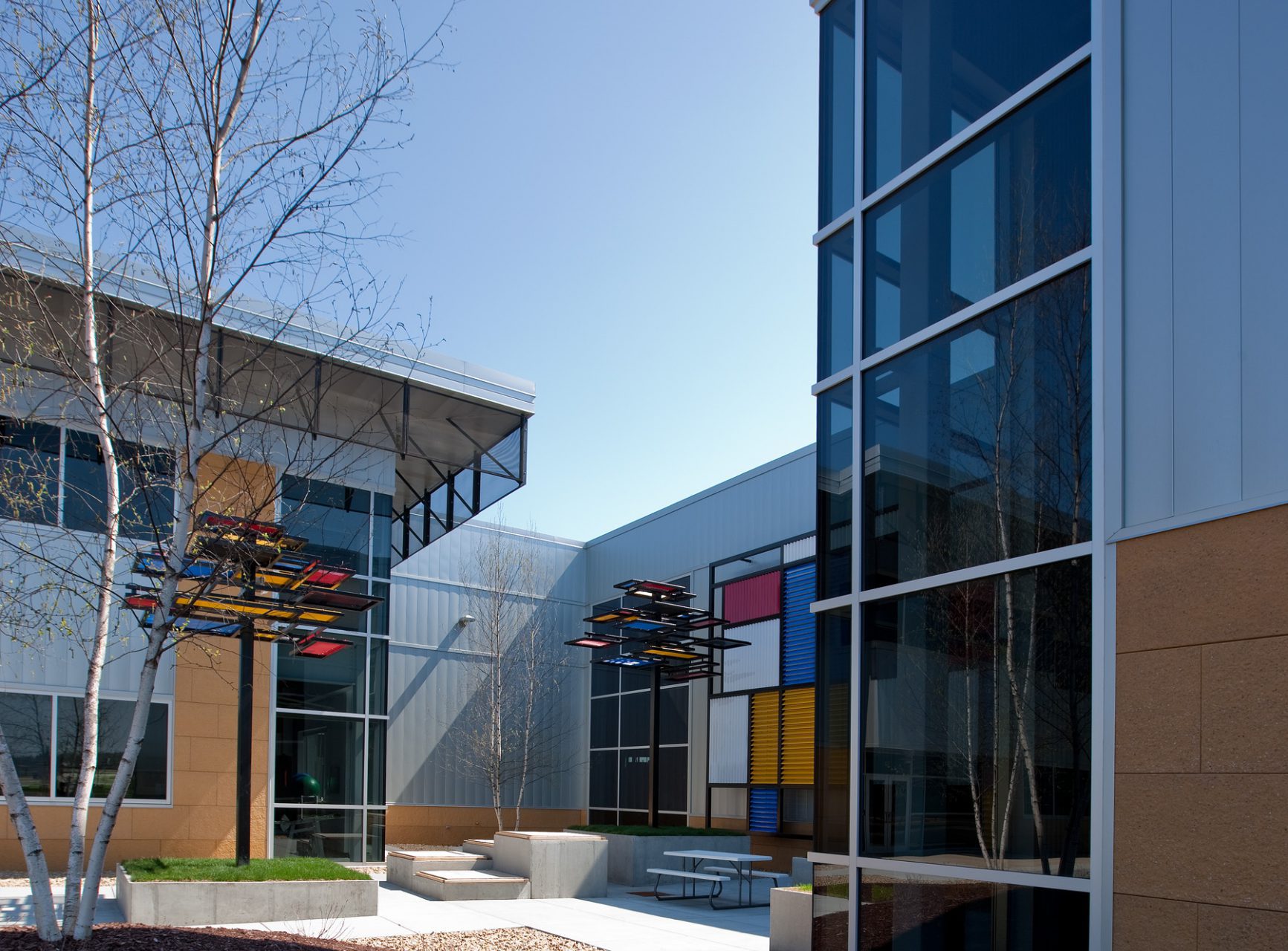 As one of the world’s leading entertainment and architectural lighting manufacturers, innovation is synonymous with Electronic Theatre Controls. Fabral Select Series 12 panels were applied as a rainscreen system. Accents of colored corrugated panels traverse the exterior. Free-standing metal sculptures mirror the effect. The components demonstrate a unique approach to using metal as a design element.